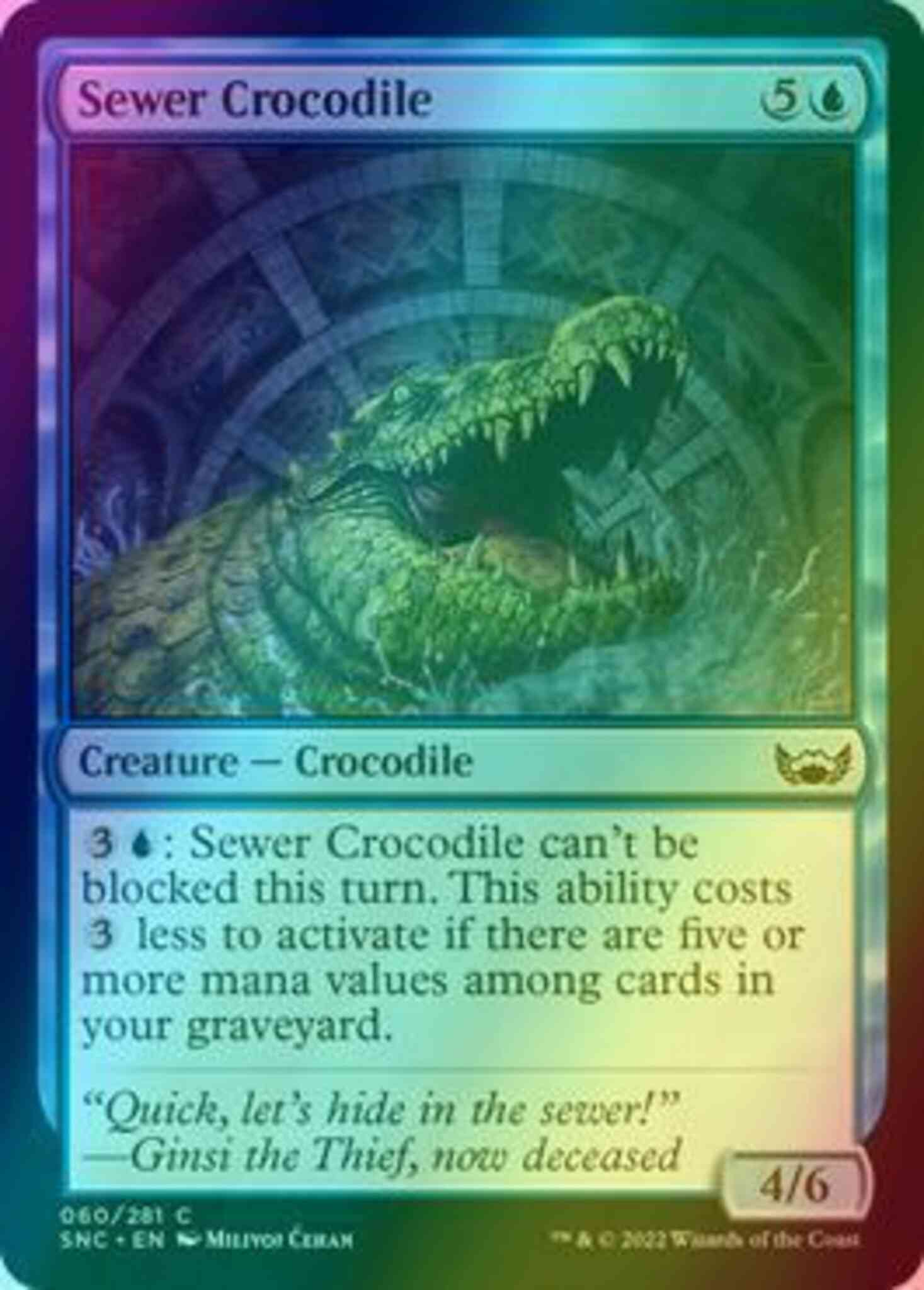 Card Text: {3}{U}: Sewer Crocodile can't be blocked this turn. This ability costs {3} less to activate if there are five or more mana values among cards in your graveyard.
