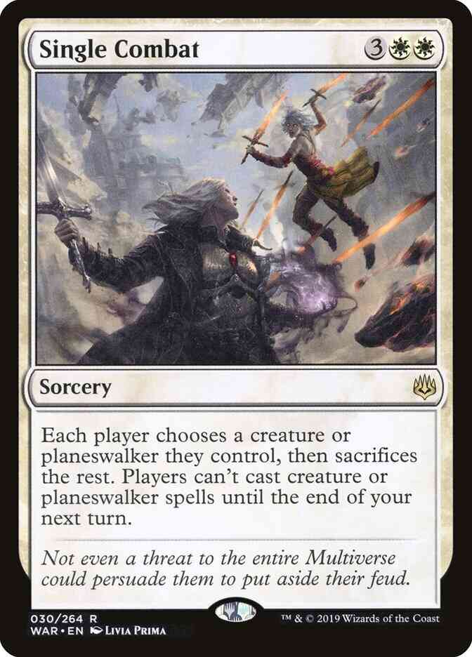 Each player chooses a creature or planeswalker they control, then sacrifices the rest. Players can't cast creature or planeswalker spells until the end of your next turn.