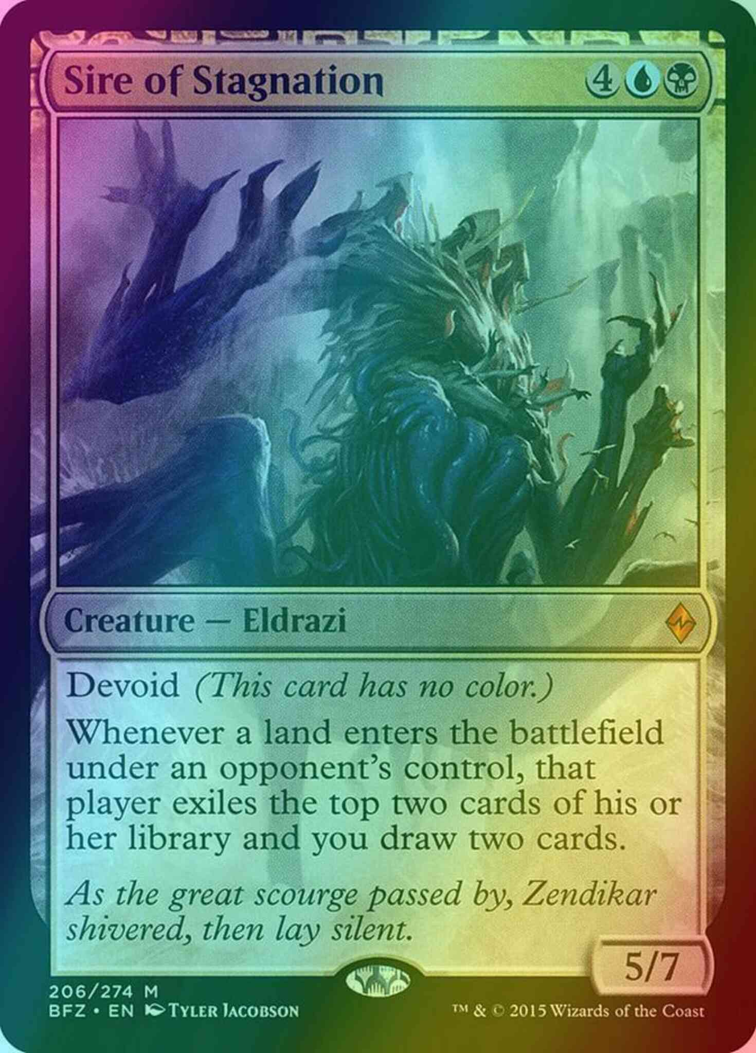 Card Text: Devoid (This card has no color.) Whenever a land enters the battlefield under an opponent's control, that player exiles the top two cards of their library and you draw two cards.