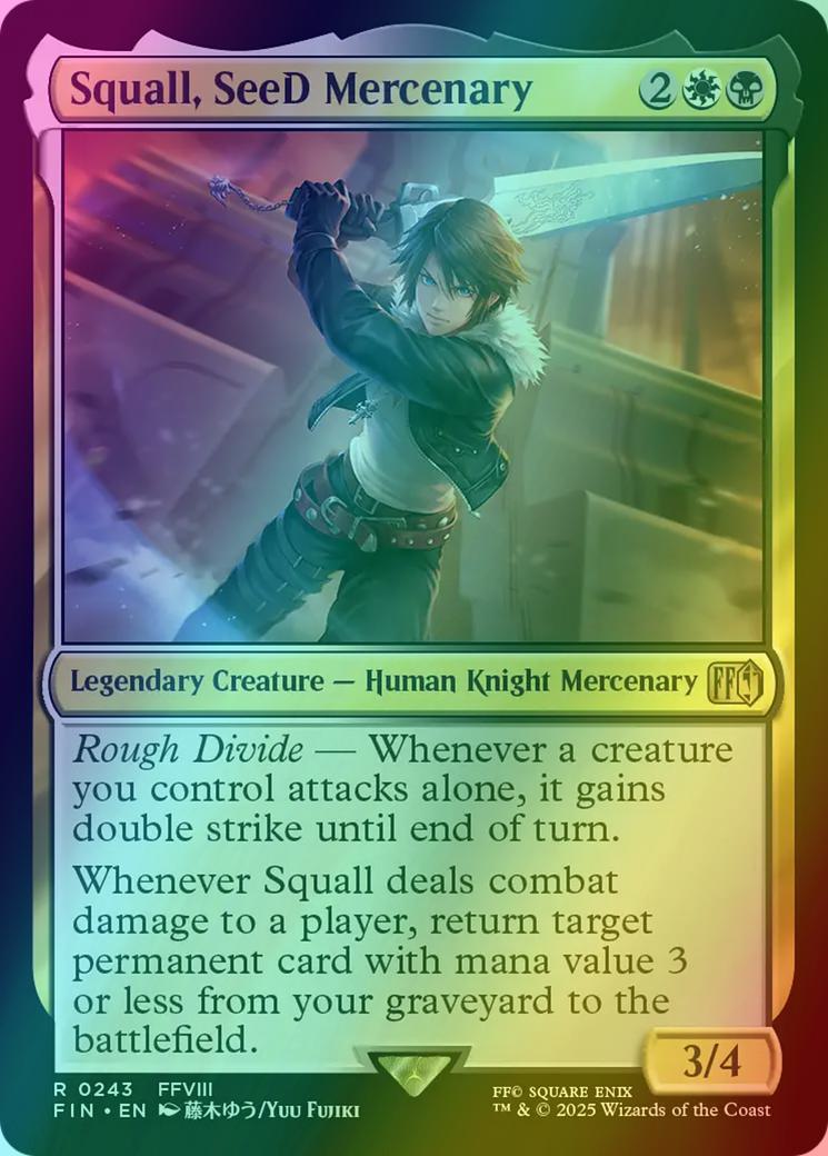 Rough Divide — Whenever a creature you control attacks alone, it gains double strike until end of turn. Whenever Squall deals combat damage to a player, return target permanent card with mana value 3 or less from your graveyard to the battlefield.