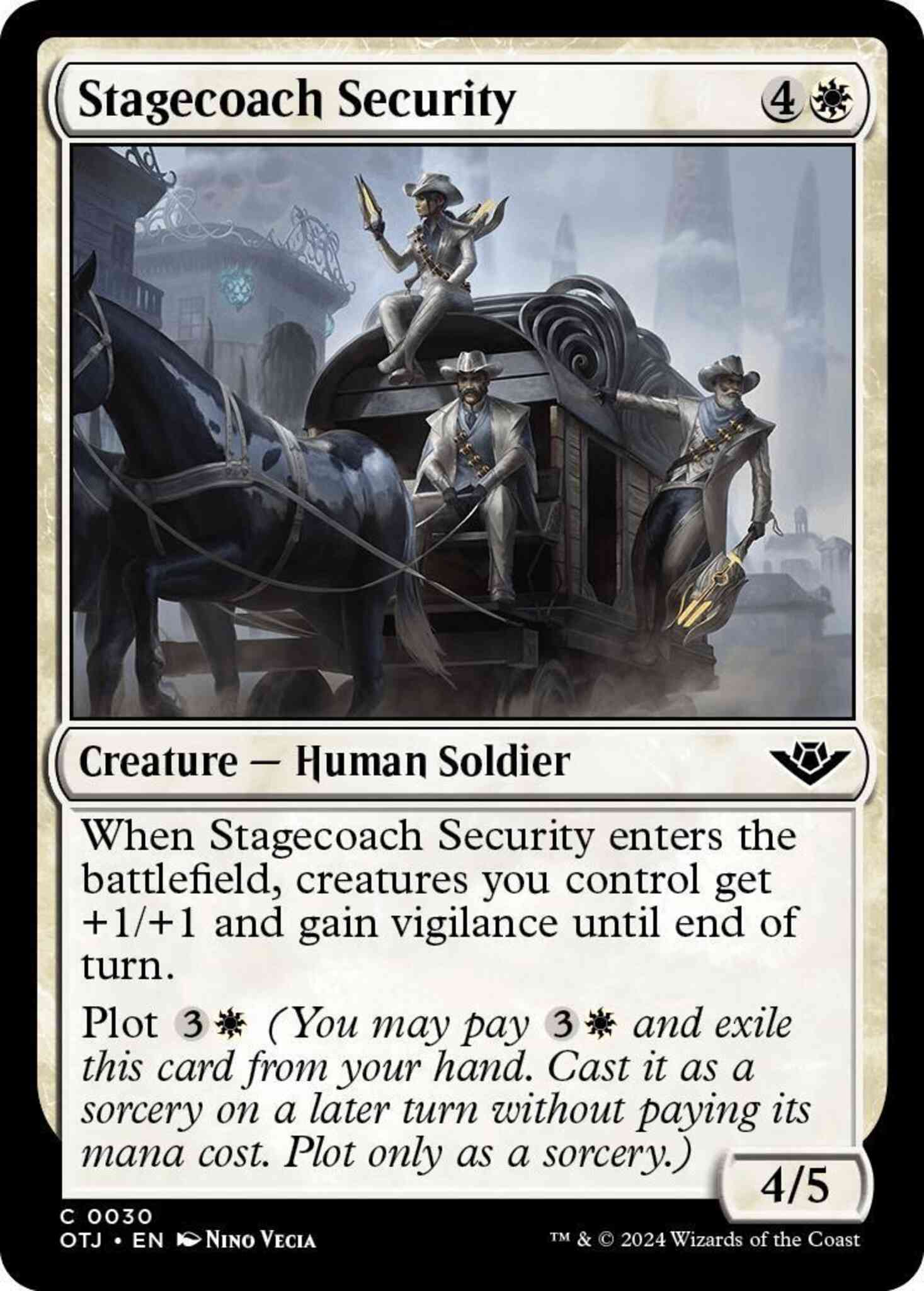 When Stagecoach Security enters the battlefield, creatures you control get +1/+1 and gain vigilance until end of turn. Plot {3}{W} (You may pay {3}{W} and exile this card from your hand. Cast it as a sorcery on a later turn without paying its mana cost. Plot only as a sorcery.)