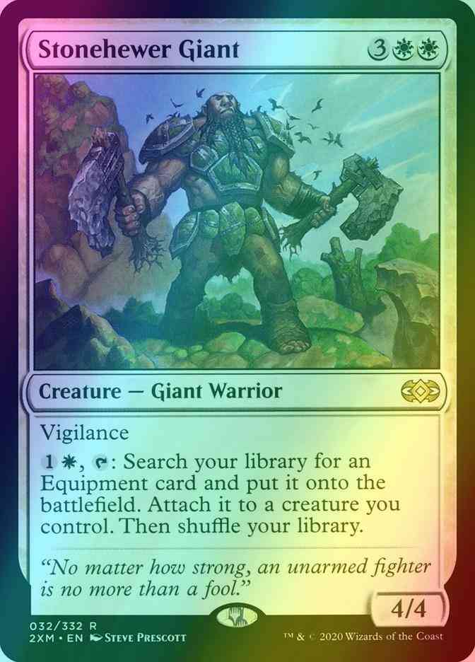 Card Text: Vigilance {1}{W}, {T}: Search your library for an Equipment card and put it onto the battlefield. Attach it to a creature you control. Then shuffle your library.