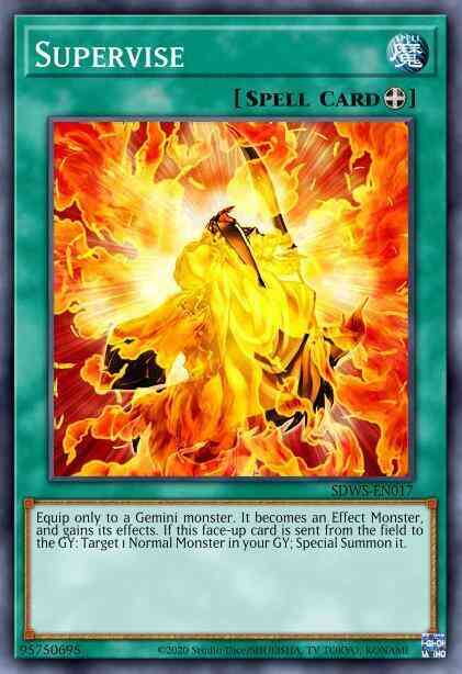 Equip only to a Gemini monster. It becomes an Effect Monster, and gains its effects. If this face-up card is sent from the field to the Graveyard: Target 1 Normal Monster in your Graveyard; Special Summon it.