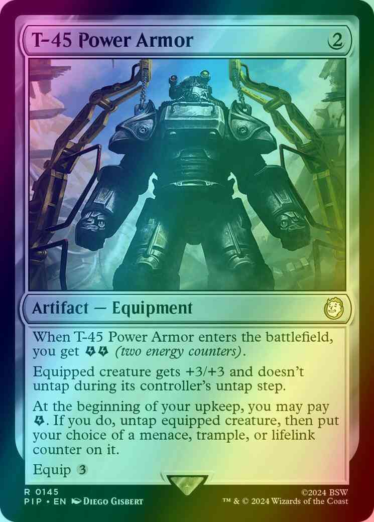 When T-45 Power Armor enters the battlefield, you get {E}{E} (two energy counters). Equipped creature gets +3/+3 and doesn't untap during its controller's untap step. At the beginning of your upkeep, you may pay {E}. If you do, untap equipped creature, then put your choice of a menace, trample, or lifelink counter on it. Equip {3}