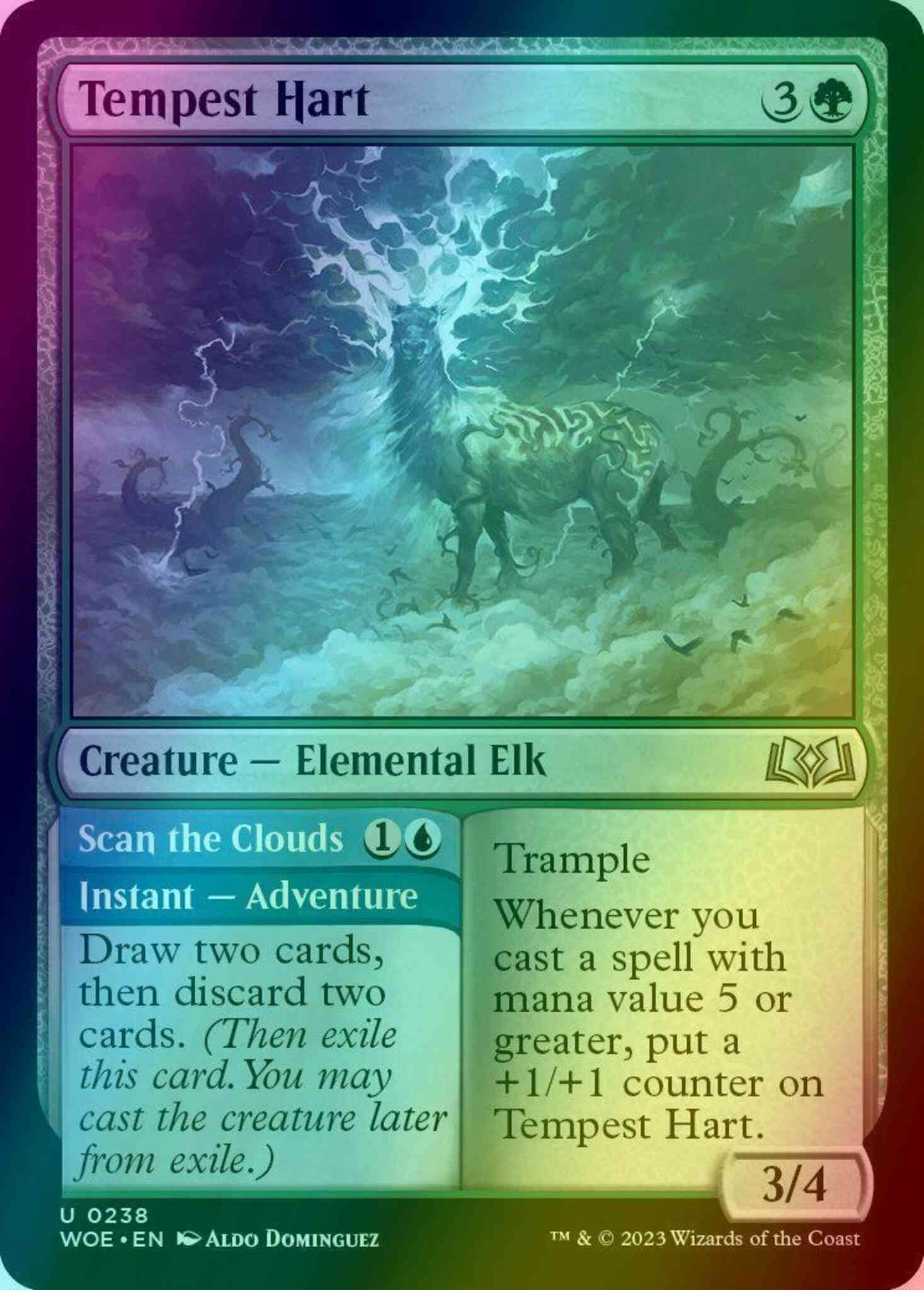 Card Text: Trample Whenever you cast a spell with mana value 5 or greater, put a +1/+1 counter on Tempest Hart.