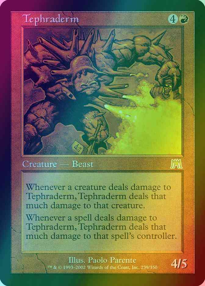 Card Text: Whenever a creature deals damage to Tephraderm, Tephraderm deals that much damage to that creature. Whenever a spell deals damage to Tephraderm, Tephraderm deals that much damage to that spell's controller.