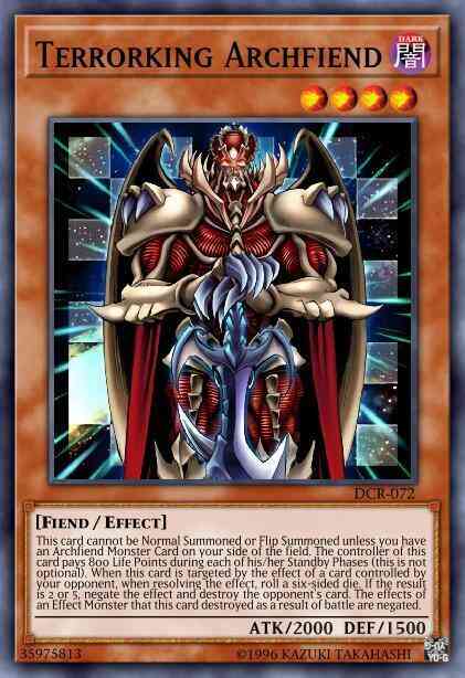 This card cannot be Normal Summoned or Flip Summoned unless you have an Archfiend Monster Card on your side of the field. The controller of this card pays 800 Life Points during each of his/her Standby Phases (this is not optional). When this card is targeted by the effect of a card controlled by your opponent, when resolving the effect, roll a six-sided die. If the result is 2 or 5, negate the effect and destroy the opponent's card. The effects of an Effect Monster that this card destroyed as a result of battle are negated.