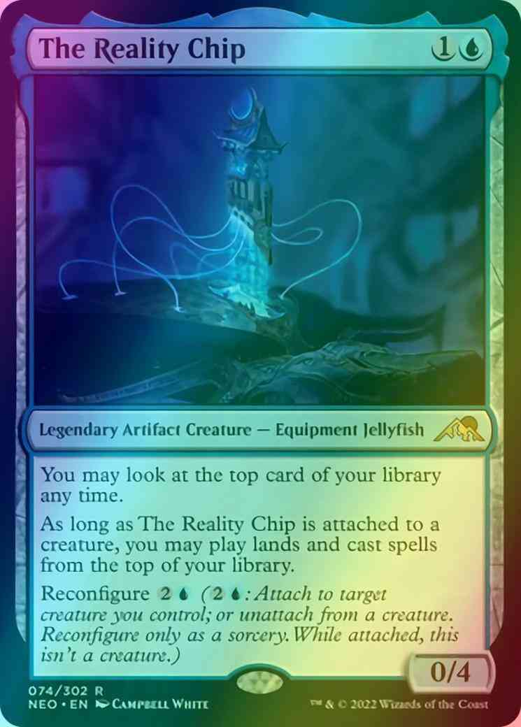 As long as The Reality Chip is attached to a creature, you may play lands and cast spells from the top of your library.