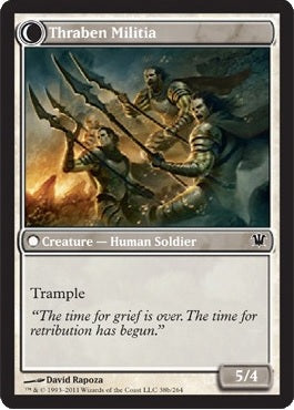 Whenever another creature you control dies, you may transform Thraben Sentry.
