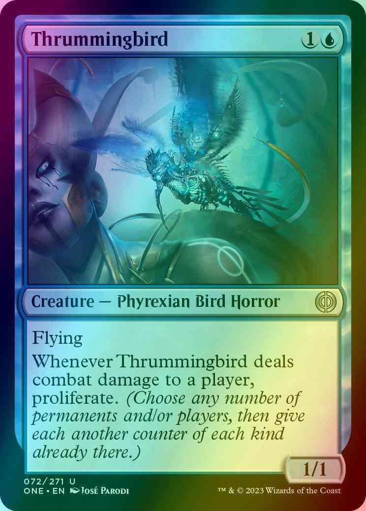 Whenever Thrummingbird deals combat damage to a player, proliferate. (Choose any number of permanents and/or players, then give each another counter of each kind already there.)