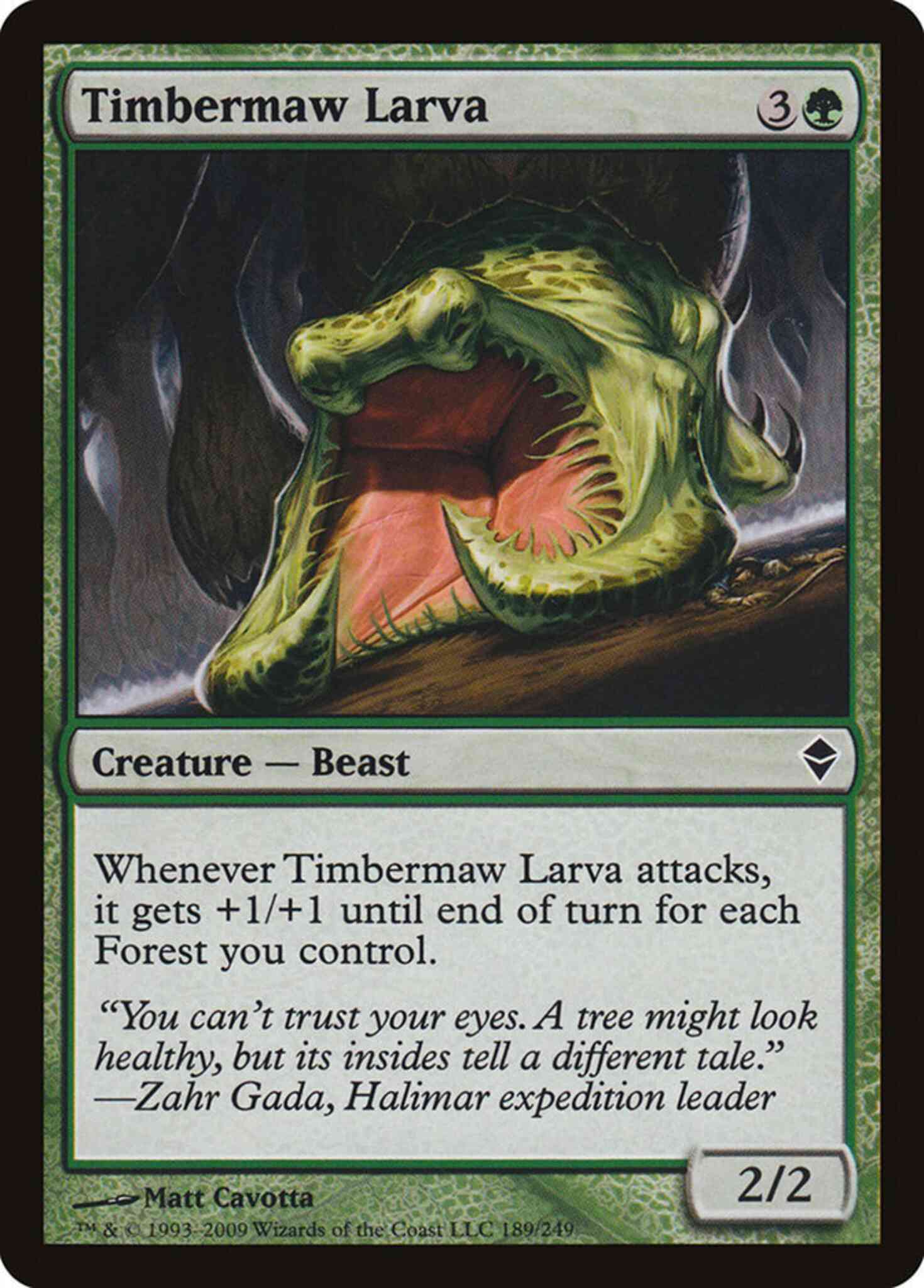 Whenever Timbermaw Larva attacks, it gets +1/+1 until end of turn for each Forest you control.