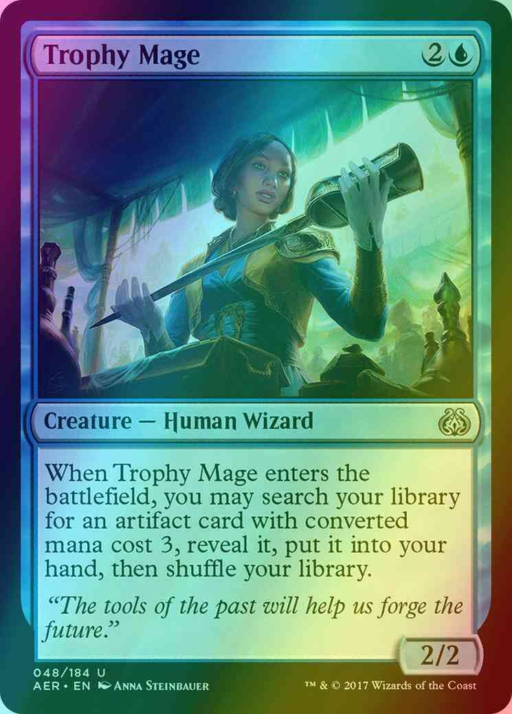 Card Text: When Trophy Mage enters the battlefield, you may search your library for an artifact card with converted mana cost 3, reveal it, put it into your hand, then shuffle your library.