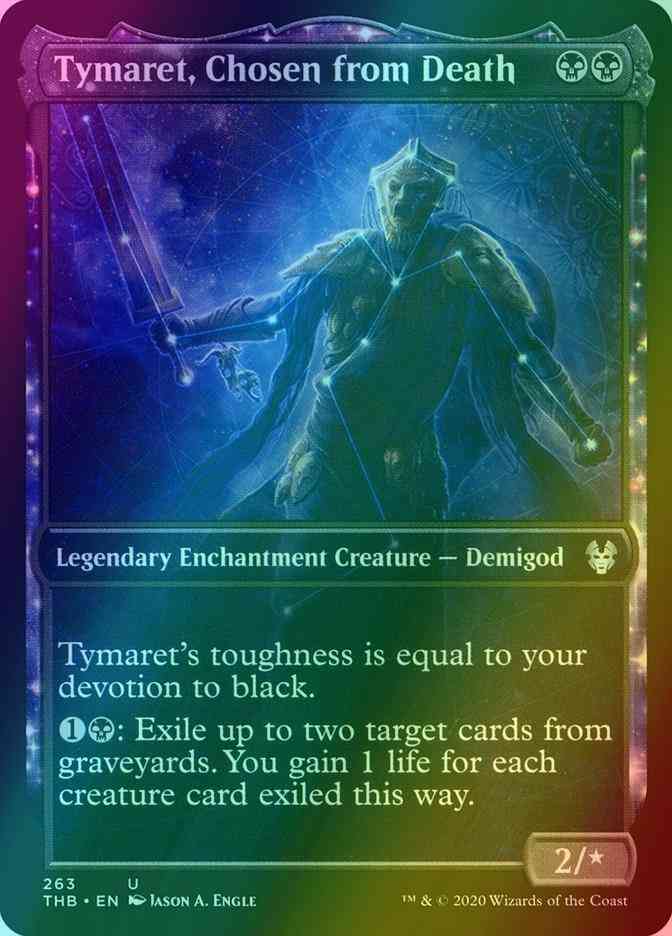 Card Text: Tymaret's toughness is equal to your devotion to black. (Each {B} in the mana costs of permanents you control counts toward your devotion to black.) {1}{B}: Exile up to two target cards from graveyards. You gain 1 life for each creature card exiled this way.