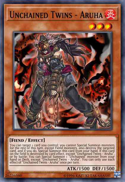 You can target 1 card you control; you cannot Special Summon monsters for the rest of this turn, except Fiend monsters, also destroy the targeted card, and if you do, Special Summon this card from your hand. If this card on the field is destroyed by card effect, except "Unchained Twins - Aruha", or by battle: You can Special Summon 1 "Unchained" monster from your hand or Deck, except "Unchained Twins - Aruha". You can only use each effect of "Unchained Twins - Aruha" once per turn.