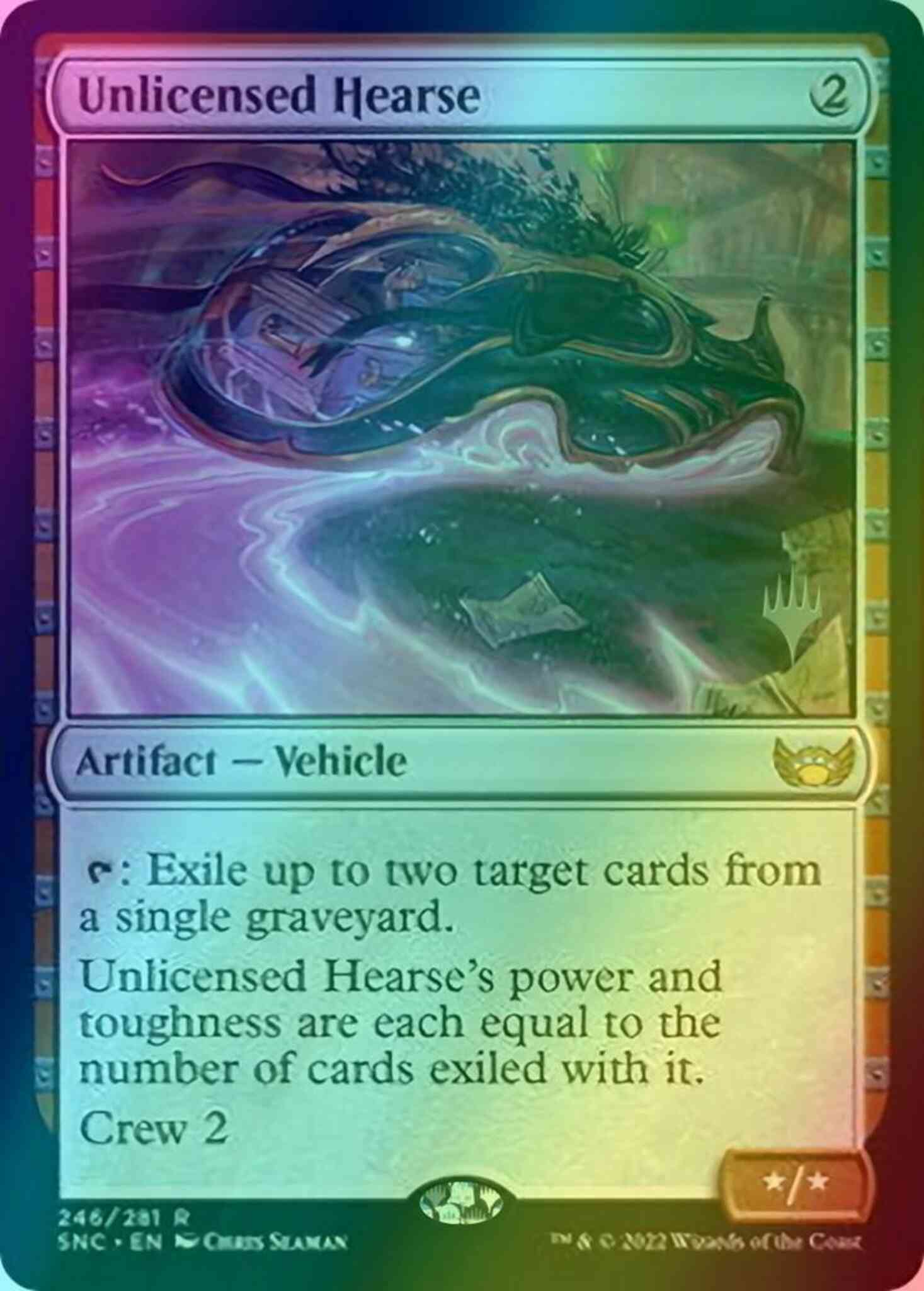 Card Text: {T}: Exile up to two target cards from a single graveyard. Unlicensed Hearse's power and toughness are each equal to the number of cards exiled with it. Crew 2