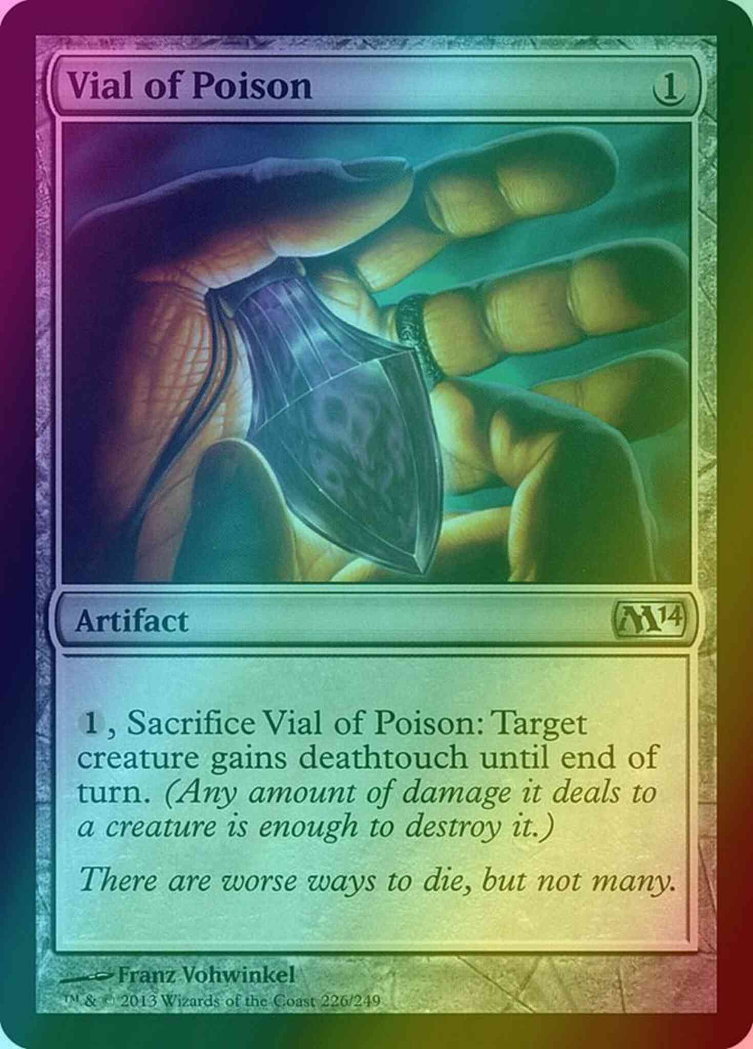 Card Text: {1}, Sacrifice Vial of Poison: Target creature gains deathtouch until end of turn. (Any amount of damage it deals to a creature is enough to destroy it.)