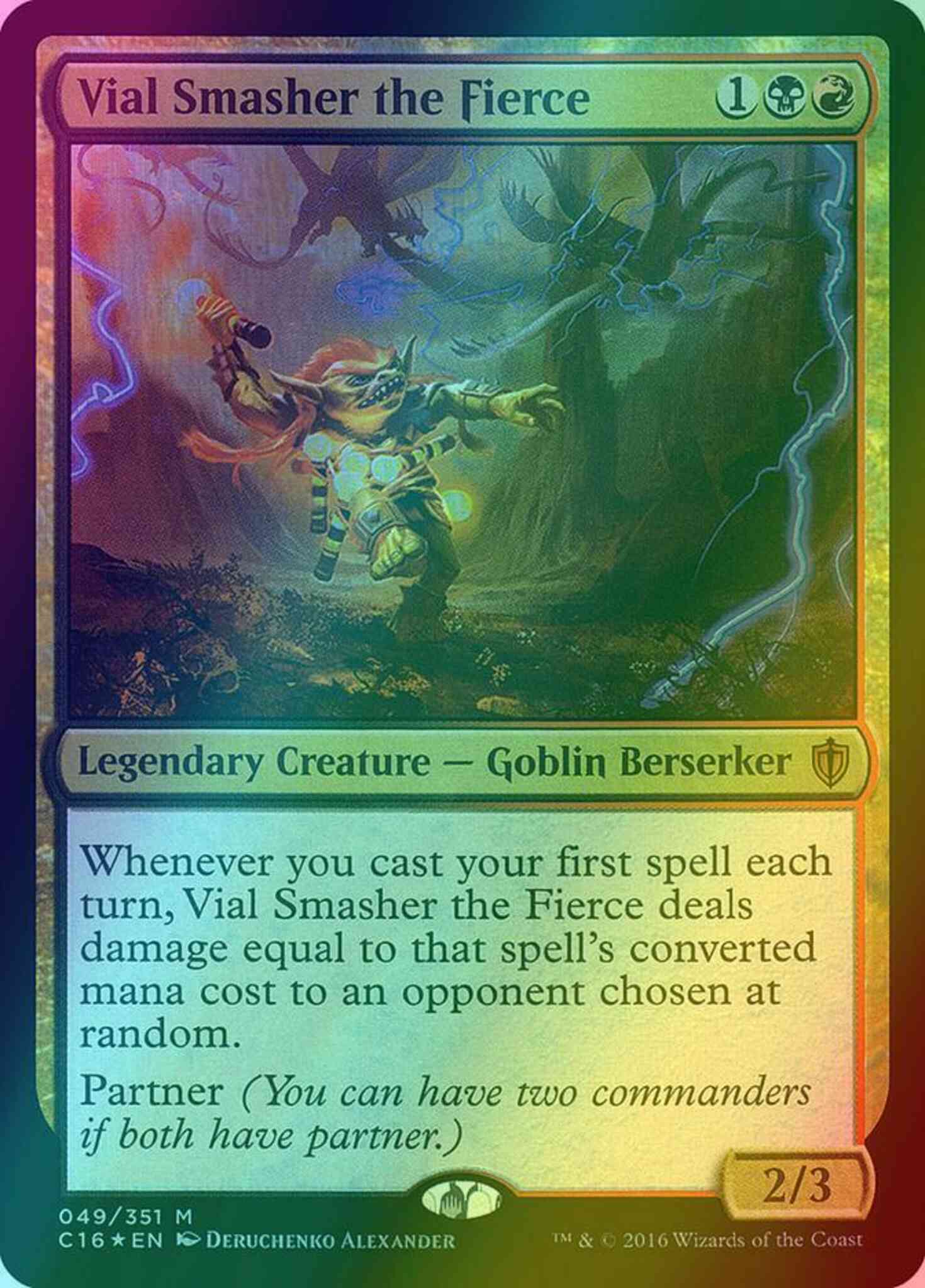 Whenever you cast your first spell each turn, choose an opponent at random. Vial Smasher the Fierce deals damage equal to that spell's converted mana cost to that player or a planeswalker that player controls.