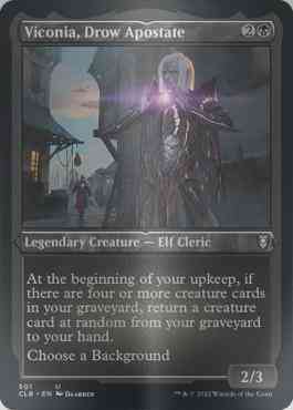 Card Text: At the beginning of your upkeep, if there are four or more creature cards in your graveyard, return a creature card at random from your graveyard to your hand. Choose a Background (You can have a Background as a second commander.)