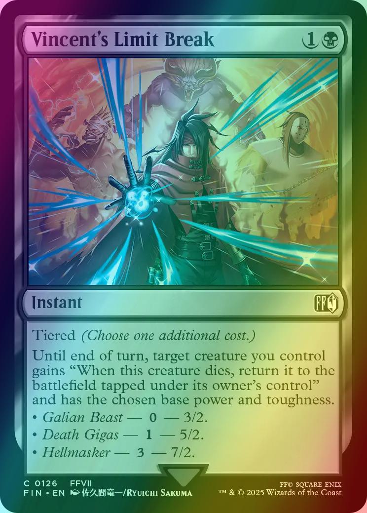 Card Text: Tiered (Choose one additional cost.) Until end of turn, target creature you control gains "When this creature dies, return it to the battlefield tapped under its owner's control" and has the chosen base power and toughness. • Galian Beast — {0} — 3/2. • Death Gigas — {1} — 5/2. • Hellmasker — {3} — 7/2.