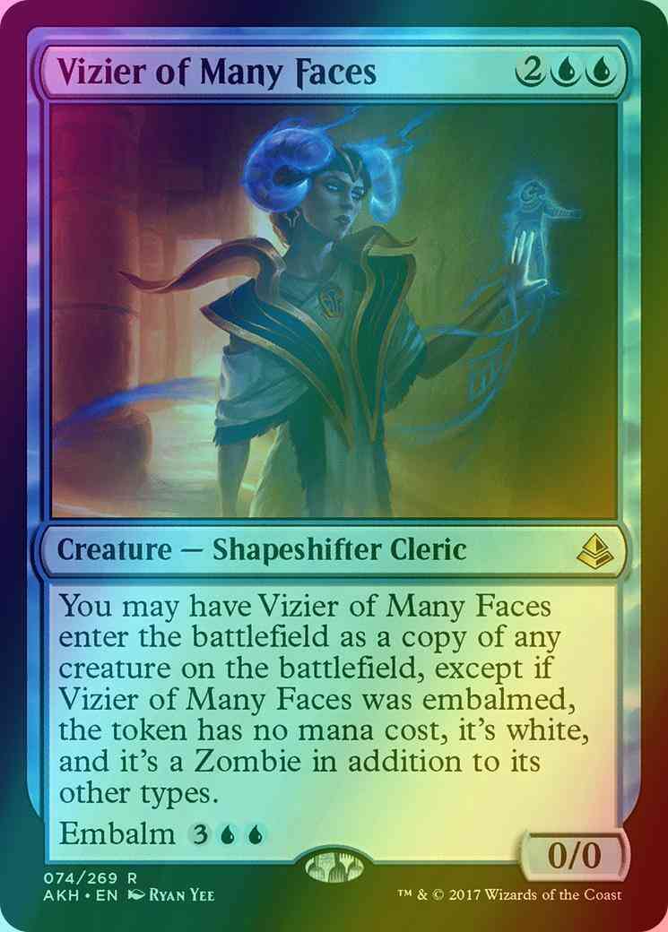 Card Text: You may have Vizier of Many Faces enter the battlefield as a copy of any creature on the battlefield, except if Vizier of Many Faces was embalmed, the token has no mana cost, it's white, and it's a Zombie in addition to its other types. Embalm {3}{U}{U}