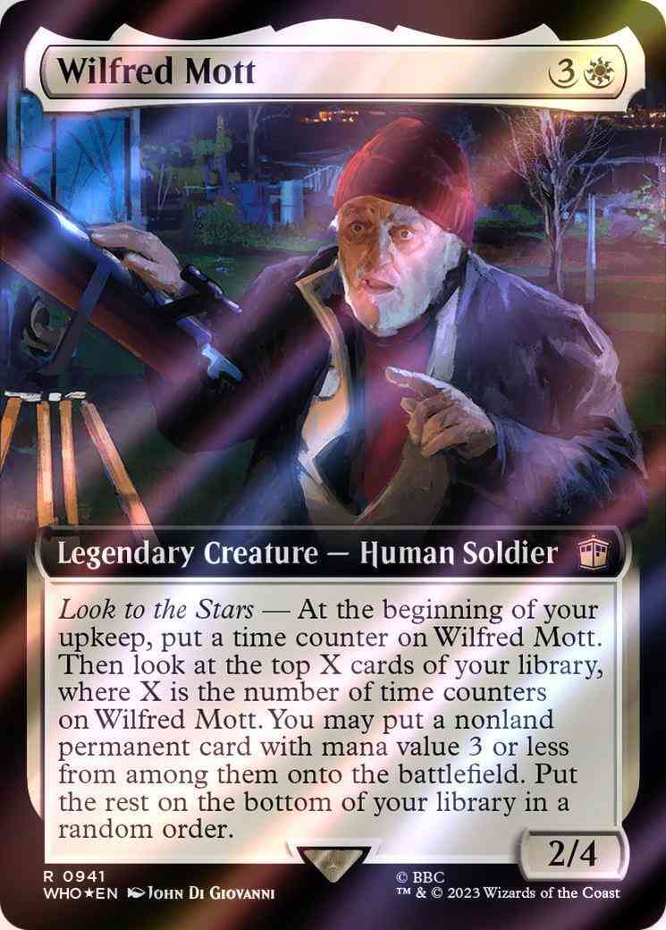 Look to the Stars — At the beginning of your upkeep, put a time counter on Wilfred Mott. Then look at the top X cards of your library, where X is the number of time counters on Wilfred Mott. You may put a nonland permanent card with mana value 3 or less from among them onto the battlefield. Put the rest on the bottom of your library in a random order.