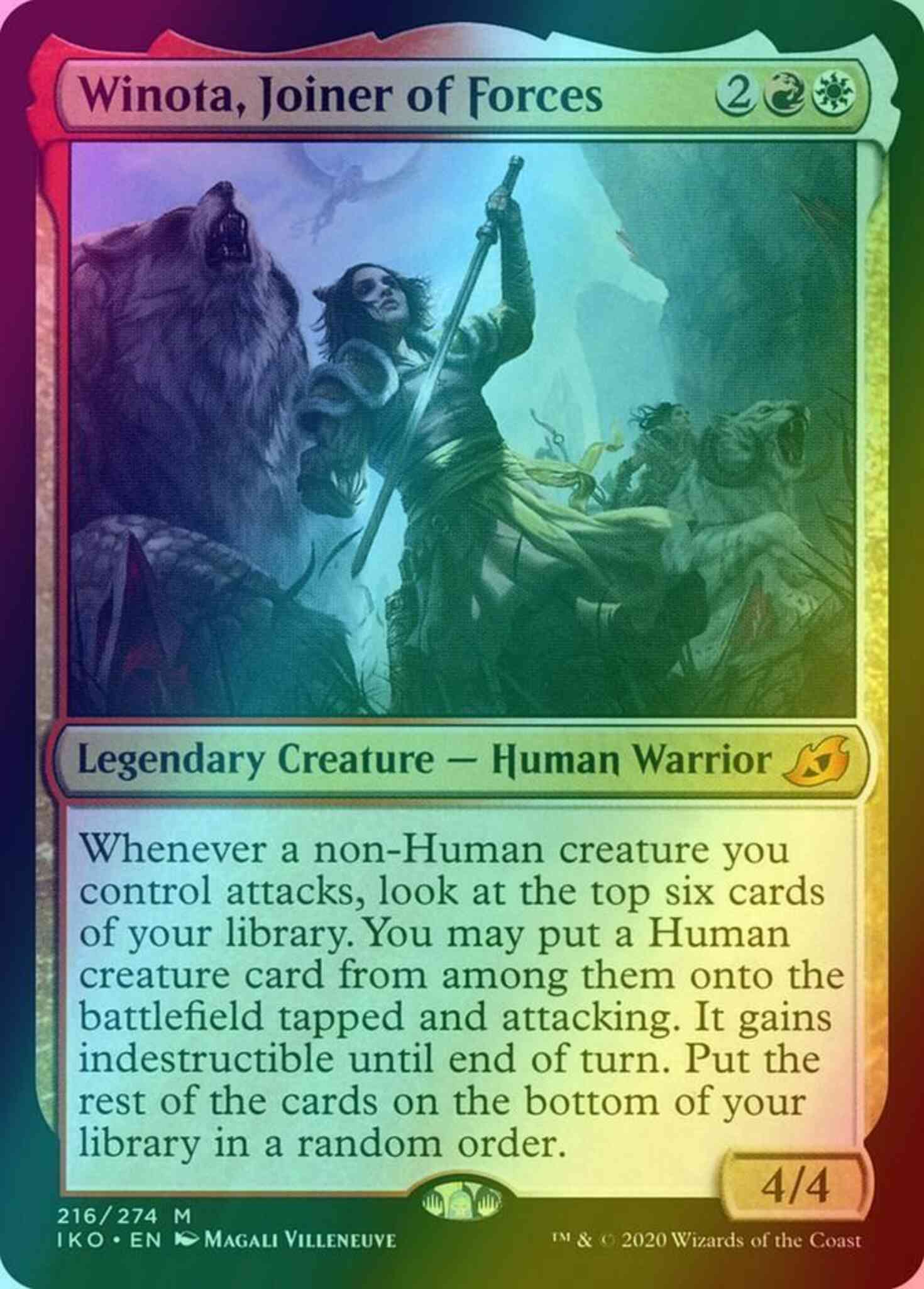 Card Text: Whenever a non-Human creature you control attacks, look at the top six cards of your library. You may put a Human creature card from among them onto the battlefield tapped and attacking. It gains indestructible until end of turn. Put the rest of the cards on the bottom of your library in a random order.