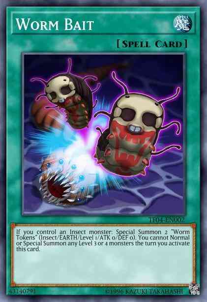 Card Text: Activate only if you control a face-up Insect-Type monster. Special Summon 2 "Worm Tokens" (Insect-Type/EARTH/Level 1/ATK 0/DEF 0) to your side of the field. You cannot Normal Summon or Special Summon Level 3 or 4 monsters the turn you activate this card.