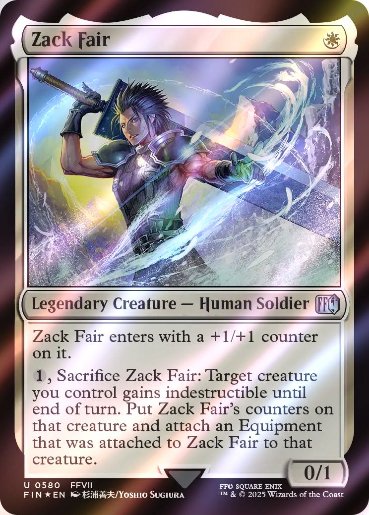 Zack Fair enters with a +1/+1 counter on it. {1}, Sacrifice Zack Fair: Target creature you control gains indestructible until end of turn. Put Zack Fair's counters on that creature and attach an Equipment that was attached to Zack Fair to that creature.